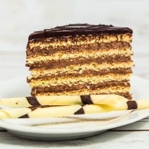 Un tort clasic ce imbină în mod plăcut straturile din cremă cu cacao și foile tipice de Doboș.